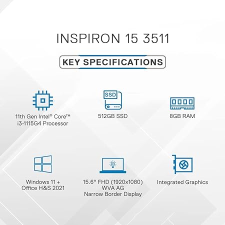 Dell Inspiron 3511 Laptop, (Intel Core i3-1115G4 Gen Processor | 8GB RAM DDR4 | 512GB SSD Card | Windows 11 + MSO’21 | 15.6"Screen (39.62cm) FHD, 3 Sided Narrow Border Design with FHD display | 15 Month McAfee | Carbon Black | 1.8kg
