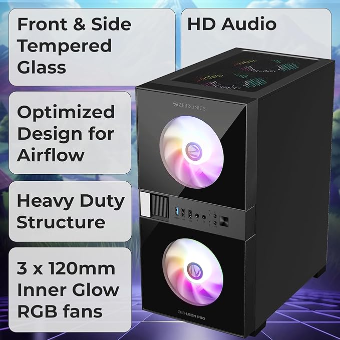 ZEBRONICS New Launch Leon PRO Premium Gaming Cabinet/Case, Mini-Tower, Supports mATX | ITX, 3 Pre-Installed RGB Fans, Side Tempered Glass, USB 3.0, Magnetic Dust Filter (Black)